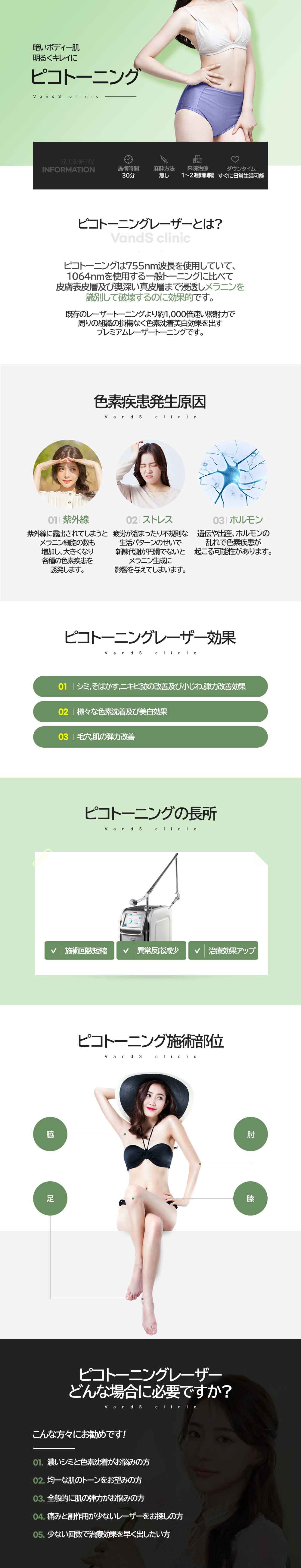 A. ピコトーニングは、既存のレーザートーニング装備の照射速度であるナノセカンド速度であるナノ秒より、 1000倍速い速度でレーザーが照射される装備です。迅速な照査速度で周辺組織の損傷や痛みを最小限に抑える メリットがあります。また、メラニンに反応率の高い波長帯を使用するため、より精密な色素治療ができます。 このようなメリットにより、レーザートーニングと同じ回数で施術した場合、肌のダメージを最小限に 抑えながら、より効果的に色素の改善を確認することができます。